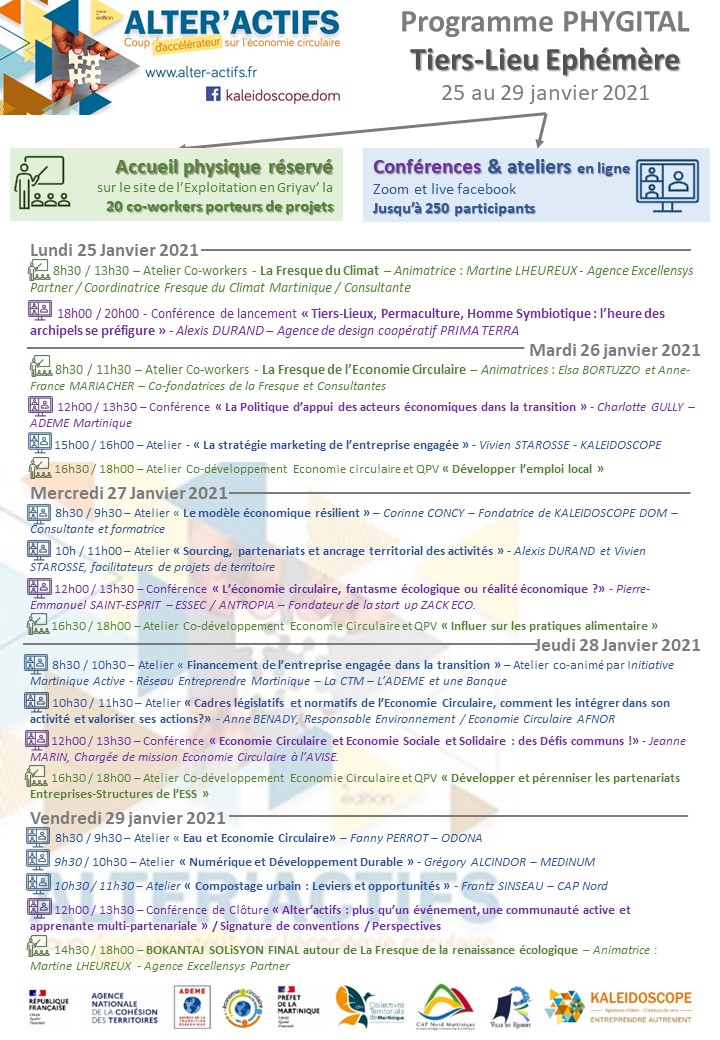 Conférence de Clôture "Alter'actifs : plus qu'un événement, une communauté active et apprenante multipartenariale" Co-animation : - Corinne CONCY, Cassandra BERENICE, Vivien STAROSSE - KALEIDOSCOPE - Alexis DURAND - PRIMA TERRA - Julien RAZAT - CTM - Elisabeth CHONQUET - PREFECTURE Martinique - Charlotte GULLY - ADEME Martinique > Présentation des outils de la communauté > Présentation du programme d'incubation 2021 de KALEIDOSCOPE > Signature de conventions avec RESEAU ENTREPRENDRE MARTINIQUE et PRIMA TERRA